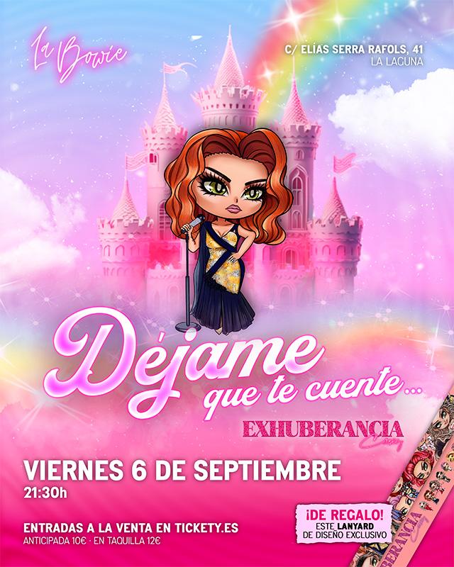 Acompaña a Exhuberancia Carey en este espectáculo donde reúne sus mejores monólogos en sus 15 años de trayectoria, déjame que te cuente narra la historia de un muchachito que quería tener un vida de cuento y terminó siendo Exhuberancia carey. Princesa o villana? No te lo pierdas y no dejes que te lo cuente un pajarito.